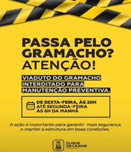 A Prefeitura de Duque de Caxias anunciou, por meio de suas redes sociais, a interdição temporária do Viaduto do Gramacho para a realização de manutenção preventiva na estrutura.
